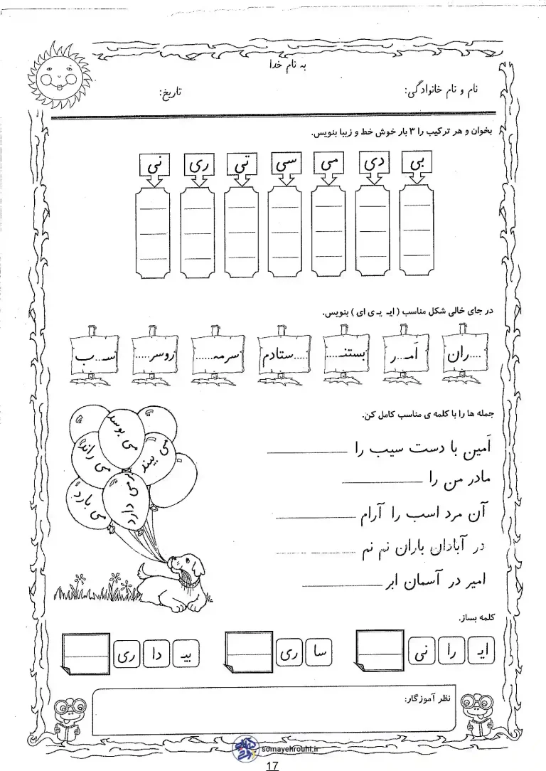 همچنین در بخش جملهسازی و کامل کردن جملهها، دانشآموز با استفاده از کلمات دادهشده، جملهها را کامل میکند که این کار به تقویت درک مطلب، جملهخوانی و افزایش دامنه واژگان کمک میکند. در انتهای کاربرگ آموزش حرف ( ایـ یـ ی ای) نیز فضایی برای نظر آموزگار در نظر گرفته شده است تا ارزیابی دقیقتری از عملکرد دانشآموز انجام شود.