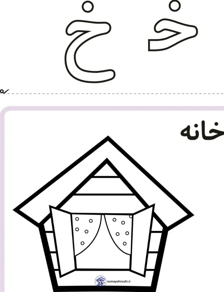 حالا نوبت مدادهای جادویی شماست! دفترهای مشقتان را باز کنید. میخواهیم نشانه «خـ خ» را بنویسیم. یادتان باشد وقتی مینویسیم، اول شکلش را میکشیم و بعد نقطهاش را دقیقاً بالای سرش میگذاریم. مثل این است که یک کلاه کوچک روی سرش گذاشته باشیم. برای رنگآمیزی این خانه زیبا هم دقت کنید. سعی کنید از خط بیرون نزنید. میتوانید پردهها را رنگی کنید و سقف خانه را قرمز یا قهوهای کنید. وقتی دارید رنگ میکنید، زیر لب صدای «خ» را زمزمه کنید تا حسابی یادتان بماند.