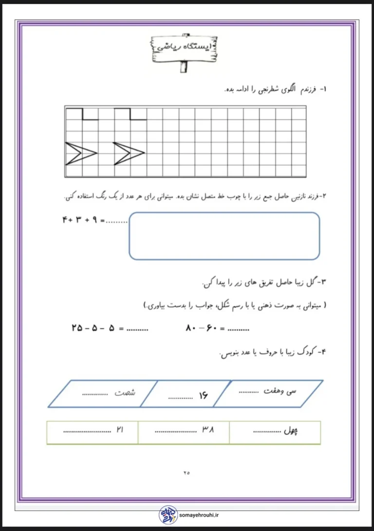 هدف اصلی این کاربرگ، تثبیت مفاهیم ریاضی آموختهشده در پایه دوم است. ویژگیهای برجسته آن شامل تمرکز بر تقویت مهارتهای دیداری و فضایی از طریق الگوهای شطرنجی (سوال ۱)، تقویت محاسبات ذهنی و سریع در جمع و تفریق (سوالهای ۲ و ۳) و درک رابطه عدد و حروف (سوال ۴) است. همچنین، سوال ۳ با تاکید بر “روش ذهنی یا رسم شکل” به دانشآموزان آزادی عمل میدهد تا با روشی که راحتترند، به پاسخ برسند و تفکر منطقی و استدلالی آنها را پرورش میدهد. این تنوع در نوع سوالات، تمام جنبههای یادگیری ریاضی را پوشش میدهد.