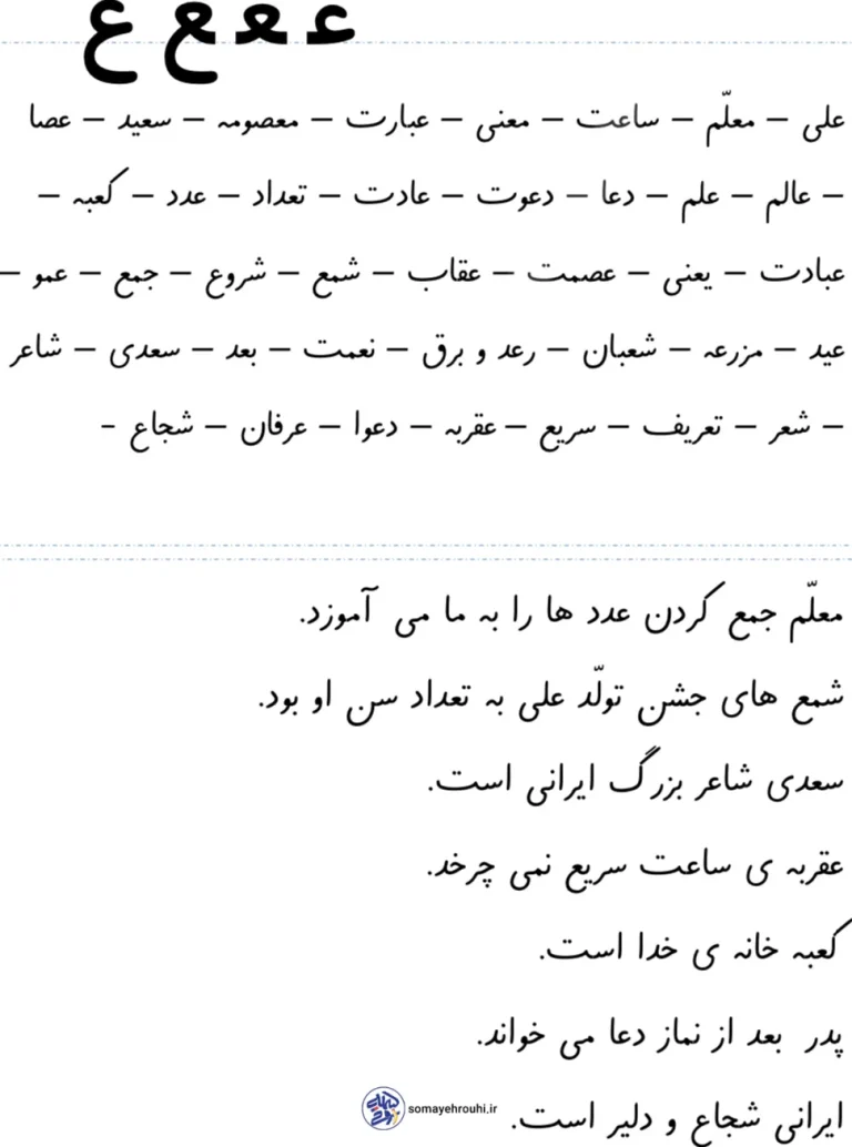 - آشنایی با شکل نوشتاری حرف “عـ ـعـ ـع ع”: کودکان با تمرینات مختلف، با نحوه نوشتن صحیح این حرف آشنا میشوند.