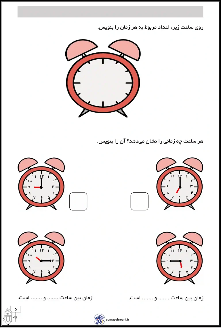 - بخش دوم: خواندن و نوشتن ساعت کامل و نیمساعت: