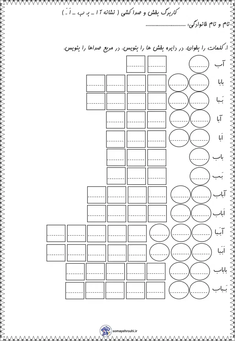کاربرگ بخش و صداکشی فارسی اول ابتدایی