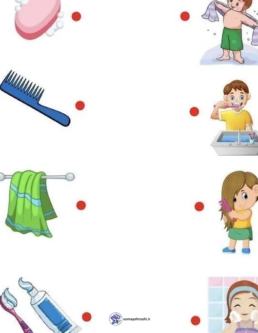 در این کاربرگ پیشدبستان، دانشآموز با مجموعهای از تصاویر وسایل بهداشتی مانند صابون، شانه، حوله و مسواک در یک سمت صفحه و تصاویری از کودکان در حال انجام کارهای بهداشتی در سمت دیگر روبهرو میشود. از کودک خواسته میشود با دقت به تصاویر نگاه کند و هر وسیله را به تصویری که کاربرد درست آن را نشان میدهد وصل کند. برای مثال، صابون به تصویر حمام کردن، مسواک به تصویر مسواک زدن و شانه به تصویر شانه کردن موها متصل میشود.