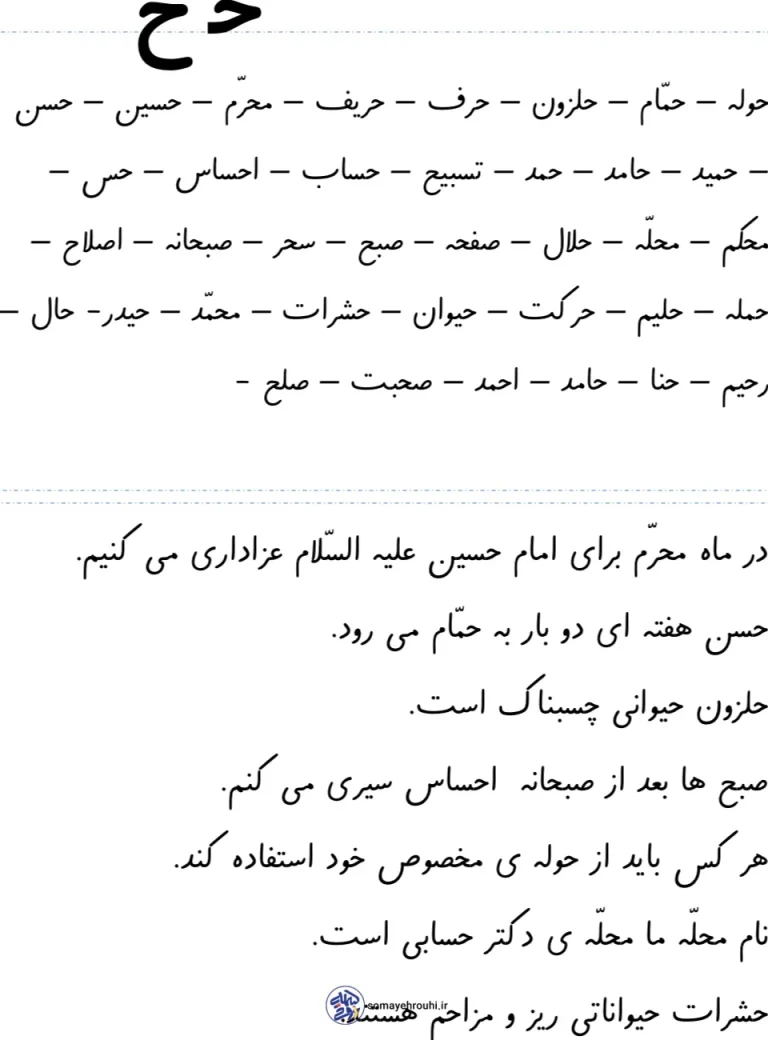 - تشکیل کلمات با حرف “ح”: دانشآموزان با استفاده از کلماتی که با حرف “ح” شروع میشوند، مهارتهای نوشتاری و درک کلمات خود را تقویت میکنند.