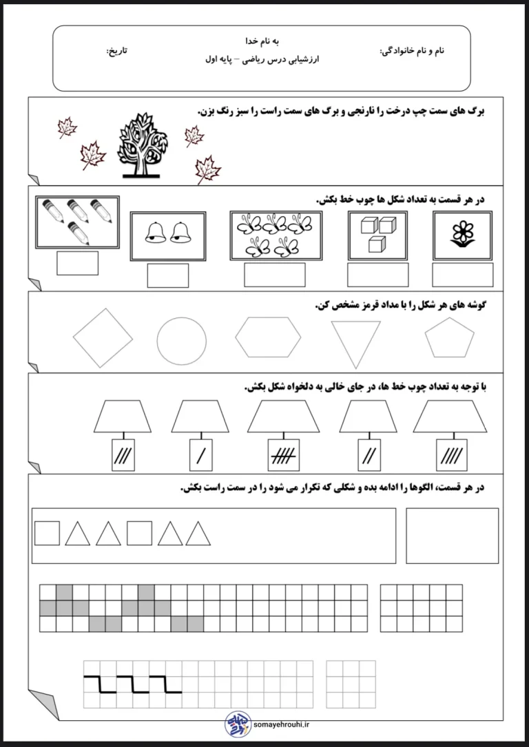کاربرگ تم ۵ ریاضی اول دبستان، ابزاری جامع برای سنجش دانشآموزان سال اول در مباحث کلیدی ریاضی است. این کاربرگ، با طراحی هدفمند، میزان تسلط نوآموزان را بر مفاهیم پایه مانند مفاهیم فضایی (چپ و راست، بالا و پایین)، شمارش، مطابقت یک به یک و درک عدد، اشکال هندسی (شناخت گوشهها) و مهارت الگویابی (دیداری و هندسی) مورد ارزیابی قرار میدهد. این ارزیابی گامی مهم در شناسایی نقاط قوت و نیازهای آموزشی هر دانشآموز است.