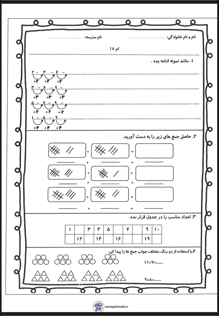 بخش سوم کاربرگ شامل یک جدول است که دانشآموز باید اعداد مناسب را در آن جایگذاری کند و احتمالا با الگویابی یا حل معادلات ساده، به پاسخ درست برسد. این بخش برای تقویت مهارتهای منطقی و تحلیل الگوها در کودکان طراحی شده است. بخش چهارم و آخر، با استفاده از تصاویر دایرهها و مثلثها، به آموزش جمعهای ساده میپردازد که دانشآموز باید با شمارش اشکال و جمع آنها، حاصل جمع را پیدا کند. این قسمت به یادگیری بصری و عینی مفاهیم ریاضی کمک شایانی میکند.