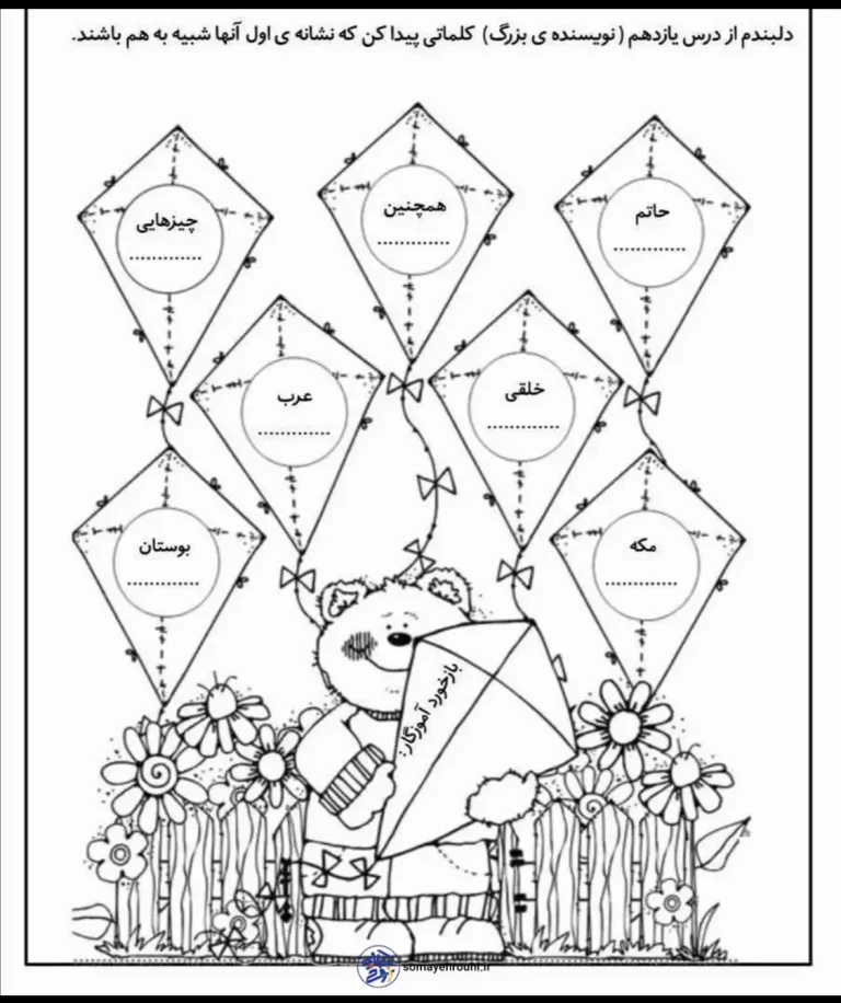 این هم یک کاربرگ جذاب درس نویسنده بزرگ فارسی سوم دبستان است. همانطور که میدانید، آموزش املای کلمات و دقت به حروف الفبا، اگر با بازی و سرگرمی همراه نباشد، برای دانشآموزان خستهکننده میشود. در این کاربرگ، ما از طرح بادبادکهای بازیگوش استفاده کردهایم تا دانشآموزان را به یک چالش کلاسی دعوت کنیم. در این تمرین، بچهها باید با جستجو در متن درس، کلماتی را شکار کنند که “نشانهی اول” آنها شبیه به کلمات داخل بادبادک باشد. این کار نه تنها دقت دیداری آنها را بالا میبرد، بلکه مرور متن درس را به یک بازی هیجانانگیز تبدیل میکند.