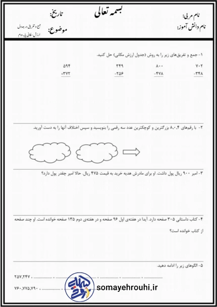 نمونه سوال جمع و تفریق انتقالی و حل مسئله دوم دبستان