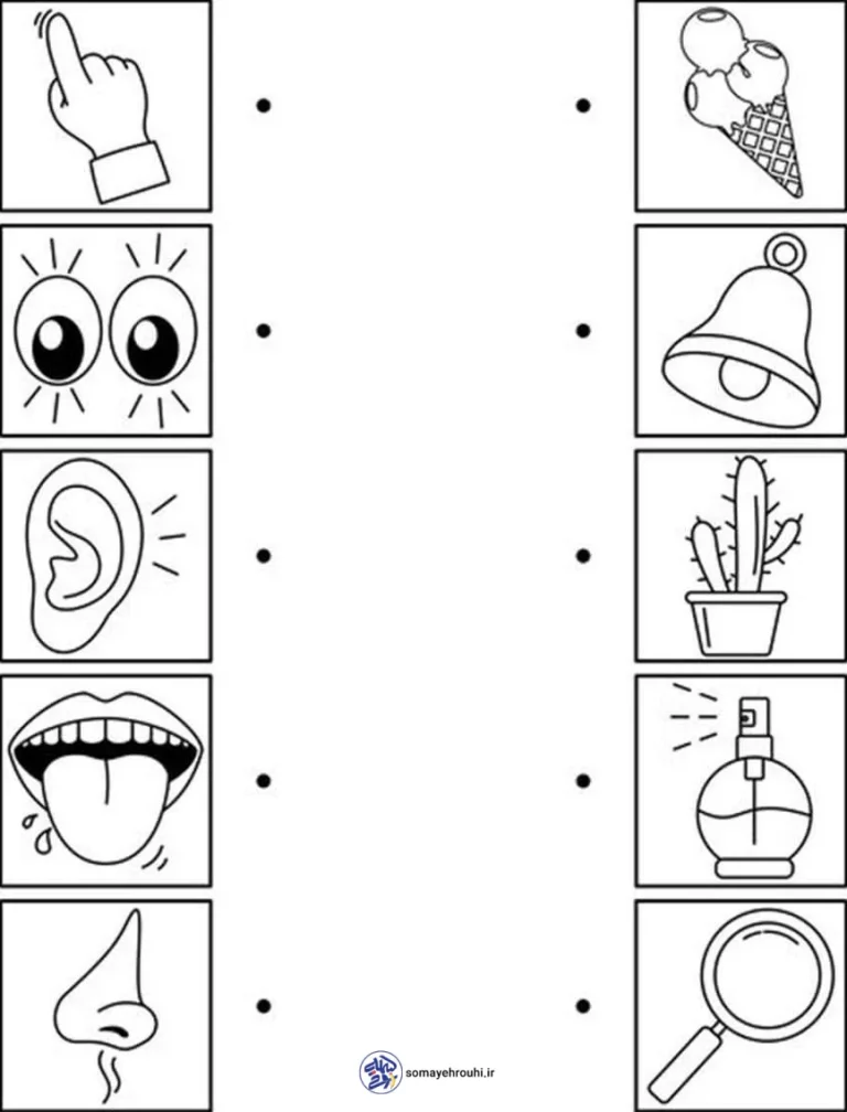 لمس کردن، دیدن، شنیدن، چشیدن و بو کردن قرار گرفته است و در سمت راست برگه تصاویری از اشیاء مختلف مانند: