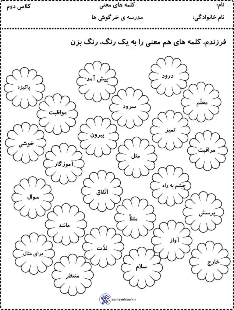 در بالای صفحه از کودک خواسته شده که هر گروه از «هممعنیها» را با یک رنگ مشخص کند، بنابراین تمام تمرکز دانشآموز باید روی همین واژههای پراکنده در فضای کاربرگ باشد تا تشخیص دهد کدام کلمات در مفهوم یکدیگر را تقویت میکنند.