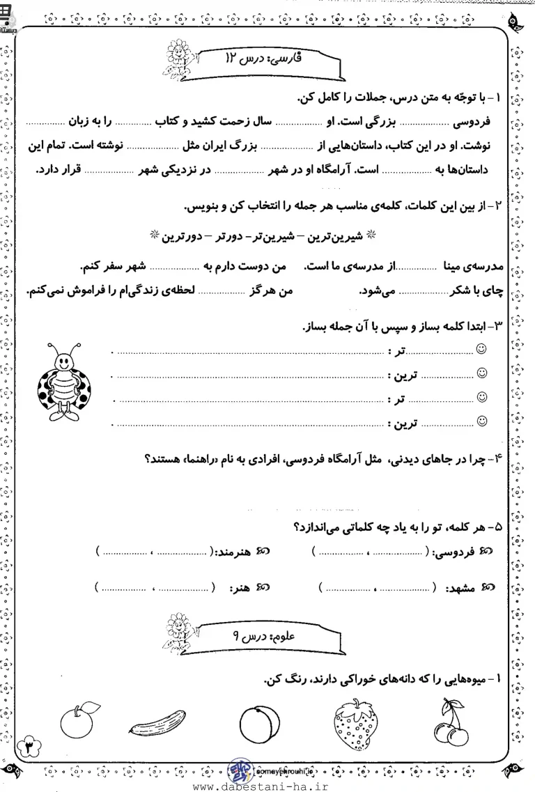 کاربرگ درس 12 فارسی دوم ابتدایی