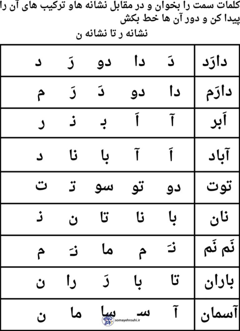یکی از مهمترین مهارتها در ماههای اول سال تحصیلی برای کلاس اولیها، توانایی تجزیه کلمات به نشانهها و ترکیبهای سازنده آنهاست. این کاربرگ رایگان فارسی نشانه «ر» تا «ن» کلاس اول دبستان دقیقاً با همین هدف طراحی شده است تا دانشآموزان بتوانند کلمات را خوانده و اجزای آن را در بین گزینههای مشابه تشخیص دهند. این تمرین برای محدوده نشانههای «ر» تا «ن» (شامل کلماتی مثل باران، نان، توت و…) آماده شده و یک ابزار عالی برای مرور و جمعبندی آموختههای دانشآموز تا اواسط سال تحصیلی محسوب میشود.