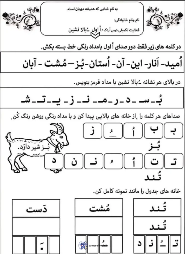 آیا این کاربرگ مخصوص پایه اول است؟ بله، به طور خاص برای دانشآموزان پایه اول دبستان طراحی شده است.