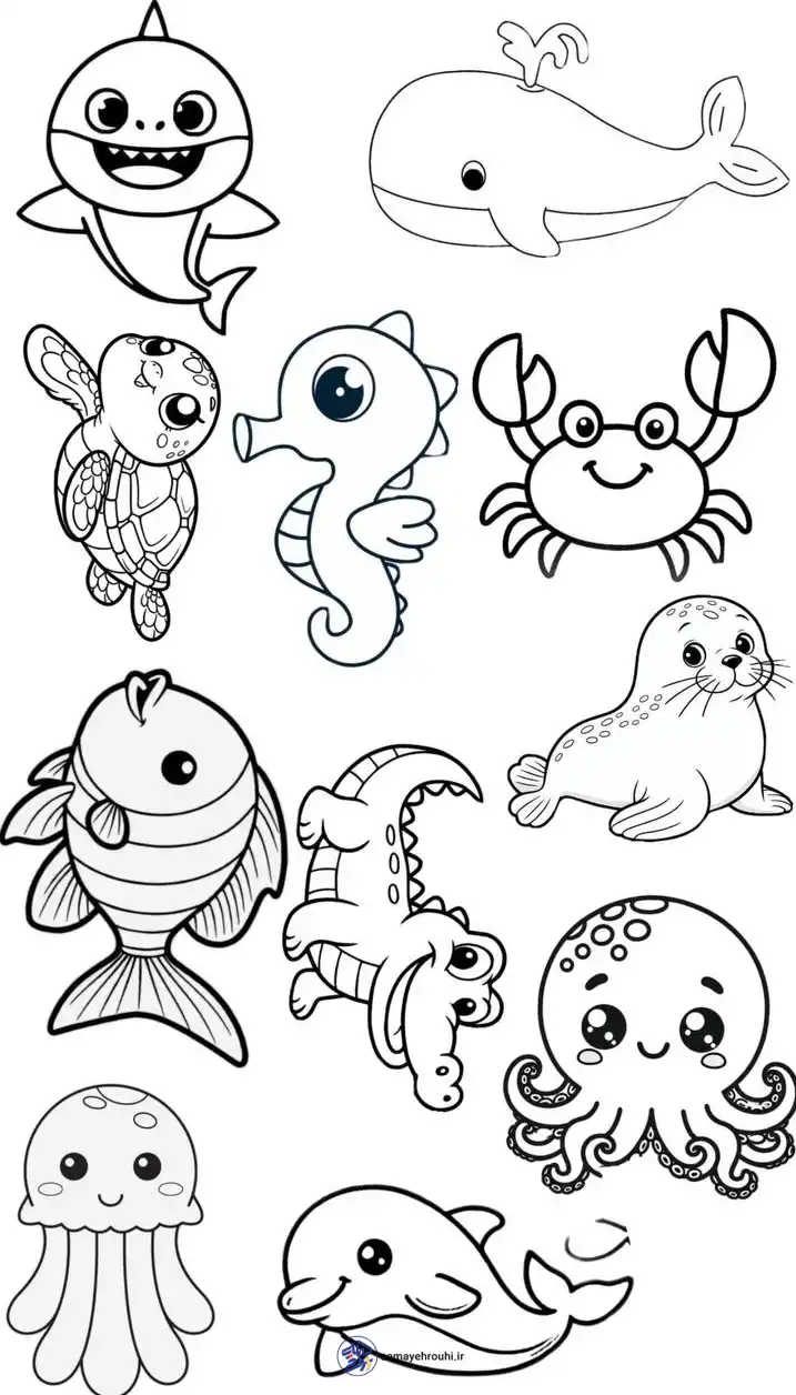 کاربرگ رنگ آمیزی جانوران دریایی شامل تصویری از جانوران آبزی است که دانشآموز باید آنها را رنگآمیزی کند. تصویر به گونهای طراحی شده که ماهیها، لاکپشت، دلفین و سایر موجودات آبزی به وضوح قابل تفکیک باشند و دانشآموز بتواند هر موجود را جداگانه مشاهده کند.