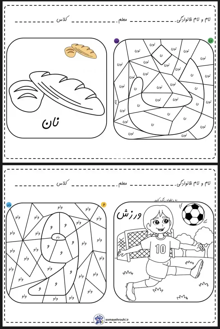 این کاربرگ رنگ آمیزی نشانه (ن – و) پیش دبستانی، ابزاری عالی برای تقویت سواد پایه در کودکان است! کودک دلبند شما با رنگآمیزی پازلهای هیجانانگیز، ضمن آشنایی با کلمات مهمی چون «نان» و «ورزش»، با اشکال و صدای حروف “ن” و “و” (نون و واو) به روشی کاملاً سرگرمکننده و فعال آشنا میشود. فعالیت “رنگآمیزی بر اساس حروف” در این کاربرگ، دقت و تمرکز دیداری کودک را به شدت بالا میبرد و یادگیری حروف را در ذهن او تثبیت میکند. این تمرین دوگانه، فرآیند یادگیری الفبا را از یک تکلیف خشک به یک بازی لذتبخش تبدیل خواهد کرد.