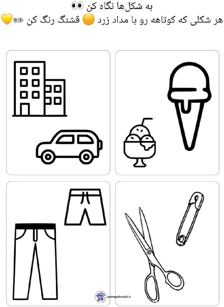 به دقت به دستورالعمل کاربرگ نگاه کنید: «به شکلها نگاه کن. هر شکلی که کوتاهه رو با مداد زرد قشنگ رنگ کن.» ✏️ اول از همه، همه شکلها را با دقت ببینید: ساختمان، ماشین، بستنی قیفی، بستنی کاسهای، شلوار، شورت، قیچی و سنجاق قفلی. حالا باید بین هر جفت شکل (مثلاً ساختمان و ماشین، یا شلوار و شورت) کوتاهترین را پیدا کنید. وقتی پیدایش کردید، با مداد زرد خودتان آن را حسابی رنگآمیزی کنید تا کارمان یک اثر هنری زیبا شود! 💛