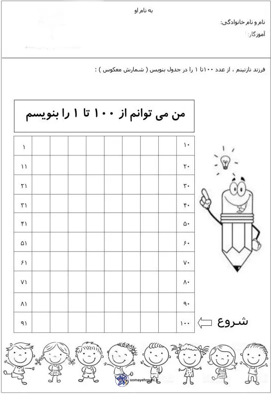 کاربرگ ریاضی آموزش اعداد ۱ تا ۱۰۰
