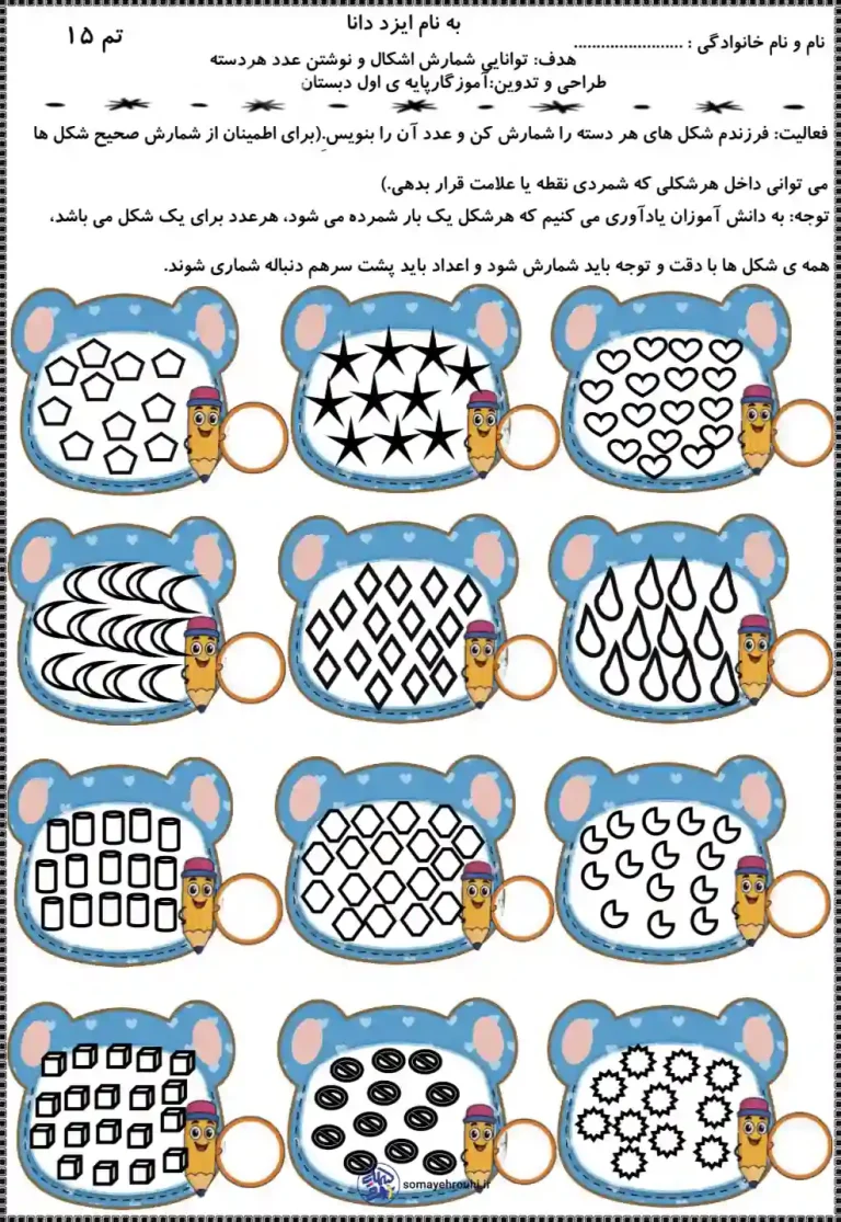 این کاربرگ ریاضی تم ۱۵ اول دبستان با هدف تثبیت و تعمیق مفاهیم پایه ریاضی طراحی شده است تا دانشآموزان بتوانند آموختههای خود را بهصورت کاربردی و مرحلهبهمرحله تمرین کنند. این کاربرگ با زبانی ساده و متناسب با سطح درک دانشآموزان کلاس اول، یادگیری را از حالت خشک و تکراری خارج کرده و به تجربهای لذتبخش تبدیل میکند.