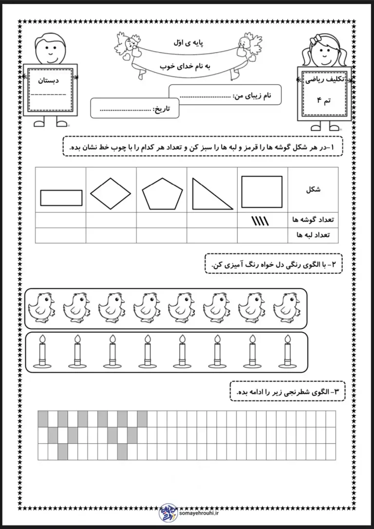 ۲. دانشآموز در بخش رنگآمیزی الگو باید دقیقاً چه کاری انجام دهد؟ در این بخش (مرغکها و شمعها)، دانشآموز باید الگوی رنگی خود (مثلاً یک در میان قرمز و آبی) را انتخاب کرده و آن را به صورت منظم و تکراری تا انتهای ردیف ادامه دهد.