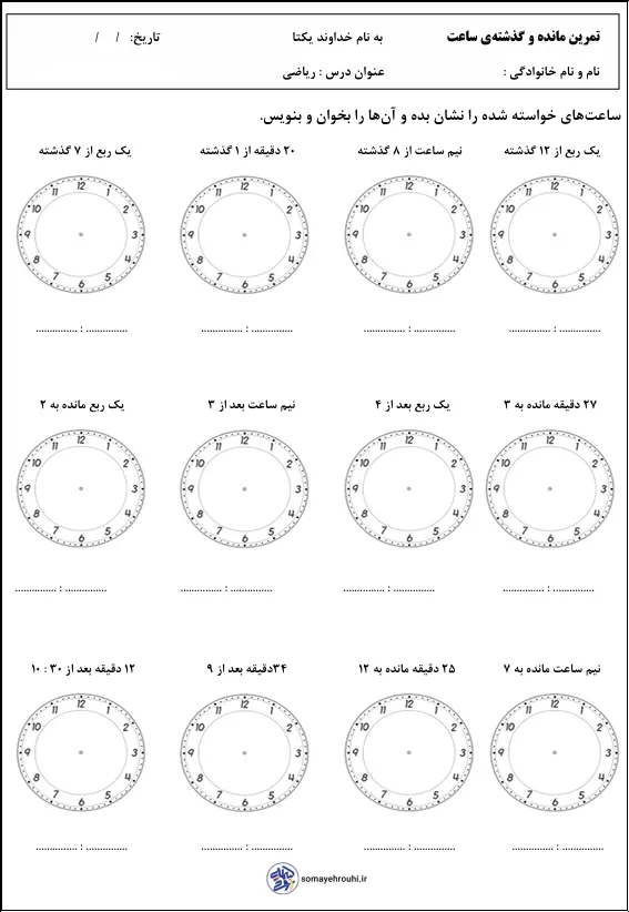 تمرینها شامل موقعیتهای متنوعی مانند «یک ربع از ساعت گذشته»، «نیم ساعت مانده به ساعت»، «چند دقیقه بعد از یک زمان مشخص» و «چند دقیقه مانده به یک ساعت» است که باعث افزایش درک مفهومی زمان و دقت دانشآموز در محاسبه ساعت میشود. طراحی تصویری ساعتها و تنوع سؤالات، این کاربرگ را برای آموزش کلاسی، تمرین در منزل و آموزش تقویتی بسیار کاربردی کرده است.