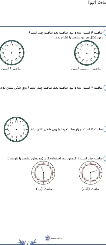 کاربرگ ساعت کلاس دوم با جواب یک فایل آموزشی کاربردی برای آموزش و تثبیت مبحث «ساعت و نیمساعت» در درس ریاضی پایه دوم است. در این کاربرگ، دانشآموزان بهصورت مرحلهبهمرحله با خواندن ساعت با استفاده از واژه «نیم»، محاسبه ساعت قبل و بعد (نیمساعت قبل و نیمساعت بعد) و نمایش زمان روی ساعتهای عقربهای آشنا میشوند.