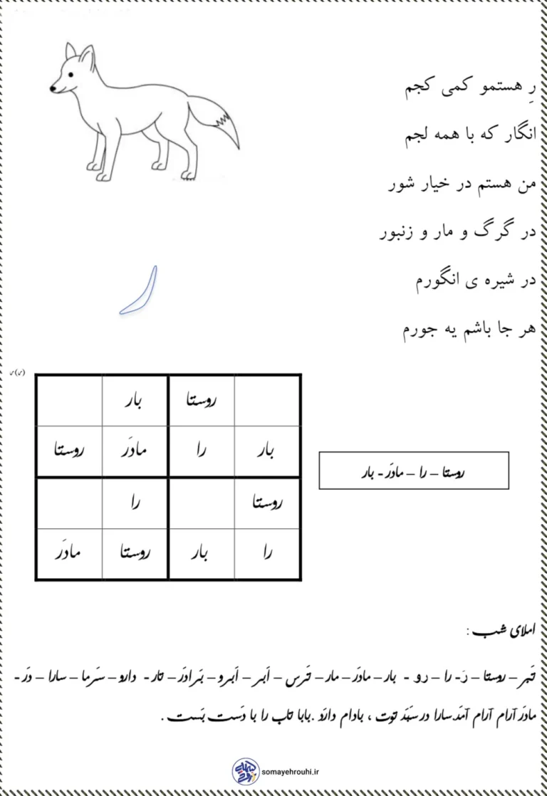 کاربرگ شعر و املا نشانه (ر) کلاس اول