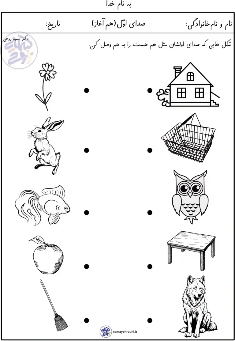 در این کاربرگ، چند تصویر در دو ستون قرار دارند. کودک باید با دقّت به نام هر تصویر گوش دهد و تصاویرى را که با یک صدای آغازین شروع میشوند بهوسیلهی خط به هم وصل کند.