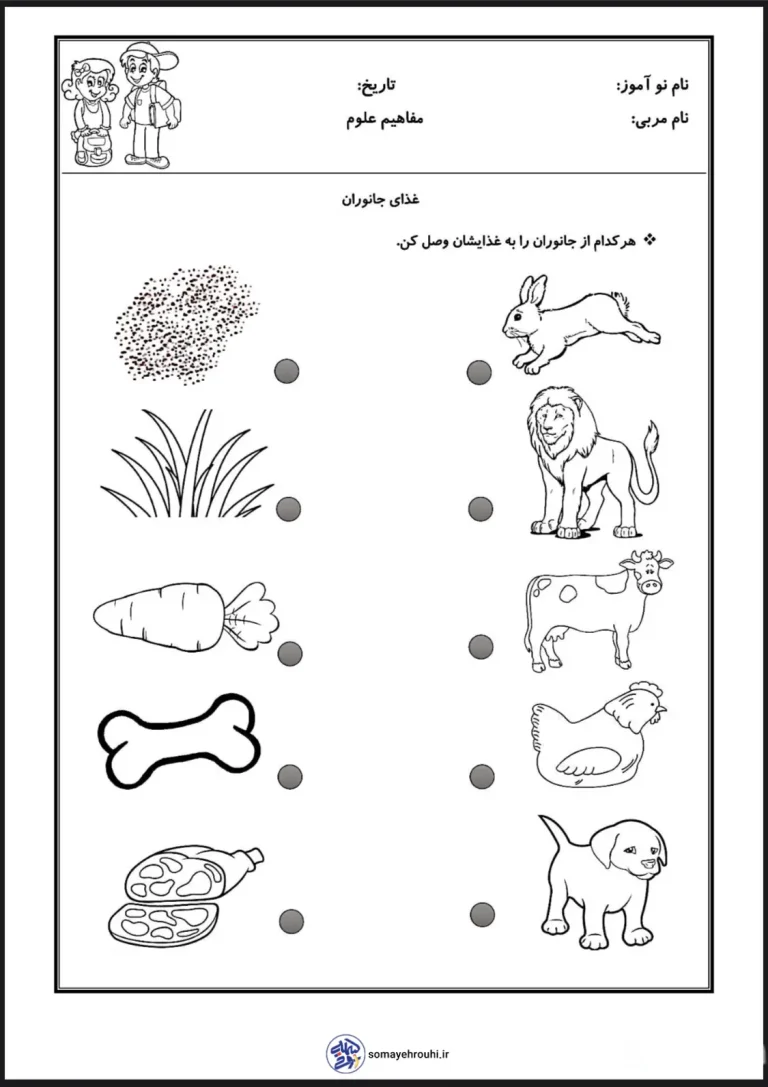 این کاربرگ علوم شناخت غذای جانوران با هدف آشنایی نوآموزان با مفاهیم اولیه علوم و به طور خاص، رژیم غذایی حیوانات مختلف طراحی شده است. هدف اصلی این فعالیت، تقویت مهارتهای مشاهده، تطبیق، و استدلال منطقی در کودکان است. با وصل کردن هر حیوان به غذای متناسب با آن، کودک درک میکند که هر موجود زندهای برای بقا به نوع خاصی از غذا نیاز دارد که این خود گامی در جهت درک چرخهی حیات و اکوسیستمهای ساده است. کاربرگ همچنین به تقویت هماهنگی چشم و دست و مهارتهای حرکتی ظریف از طریق رسم خطوط اتصال کمک میکند.