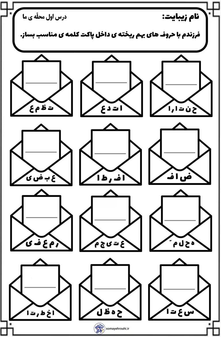 این کاربرگ فارسی درس اول (محله ما) پایه سوم دبستان، ابزاری عالی برای تقویت مهارتهای املایی و واژهسازی در دانشآموزان است. در این تمرین، حروف یک کلمه به صورت درهم ریخته داخل پاکتهای نامه قرار گرفتهاند و وظیفه دانشآموز این است که با جابهجایی و ترکیب صحیح این حروف، کلمه معنیدار و مناسب را کشف کرده و در بالای پاکت بنویسد. این فعالیت نه تنها یک بازی فکری سرگرمکننده است، بلکه یک تمرین حیاتی برای تثبیت شناخت حروف، جایگاه آنها در کلمه و افزایش دایره واژگان فارسی به شمار میرود.