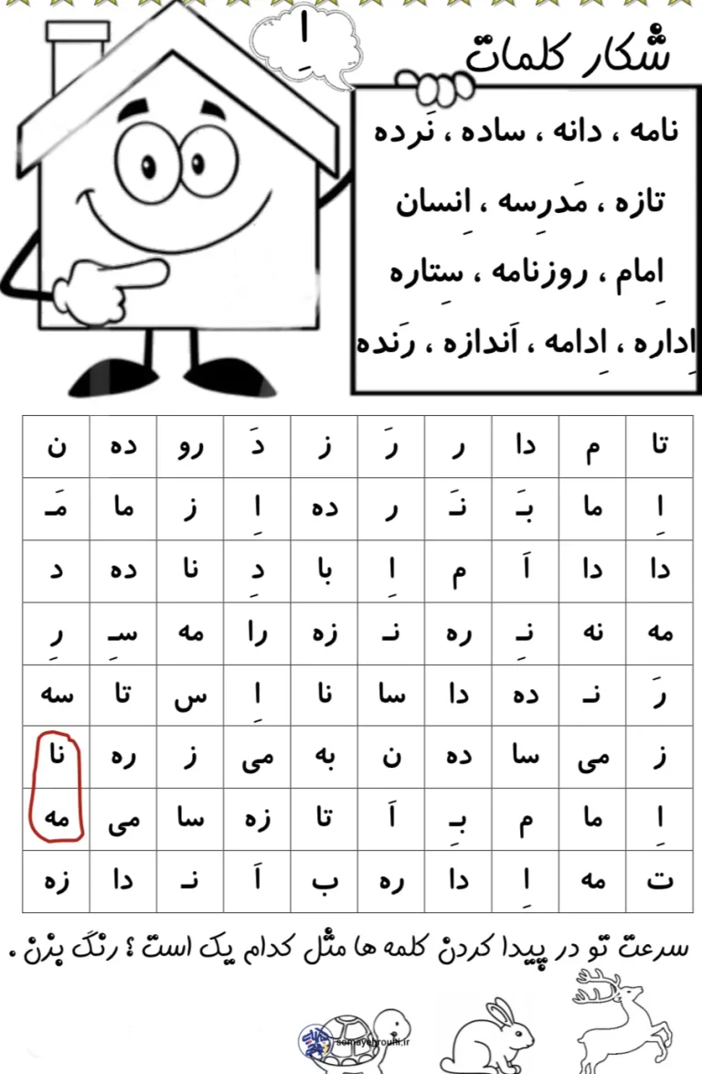این کاربرگ با طراحی زیبا و ساده خود، برای استفاده در منزل (تکلیف) و کلاس درس (فعالیت گروهی یا فردی) کاملاً مناسب است. در این کاربرگ، کلمات به صورت افقی، عمودی، یا مورب چیده شدهاند که این تنوع، مهارتهای جهتیابی دیداری و تمرکز کودک را به چالش میکشد. در پایین صفحه، سه تصویر از حیوانات (لاکپشت، خرگوش، آهو) قرار داده شده که به عنوان یک معیار تشویقی و انگیزشی برای سرعت عمل در نظر گرفته شده است: کودک میتواند پس از اتمام کار، خود را در یکی از سه سطح سرعتی آهسته (لاکپشت)، متوسط (خرگوش)، یا سریع (آهو) ارزیابی کند و آن را رنگآمیزی نماید که این عمل، حس مالکیت بر فرآیند یادگیری و خودارزیابی را تقویت میکند.