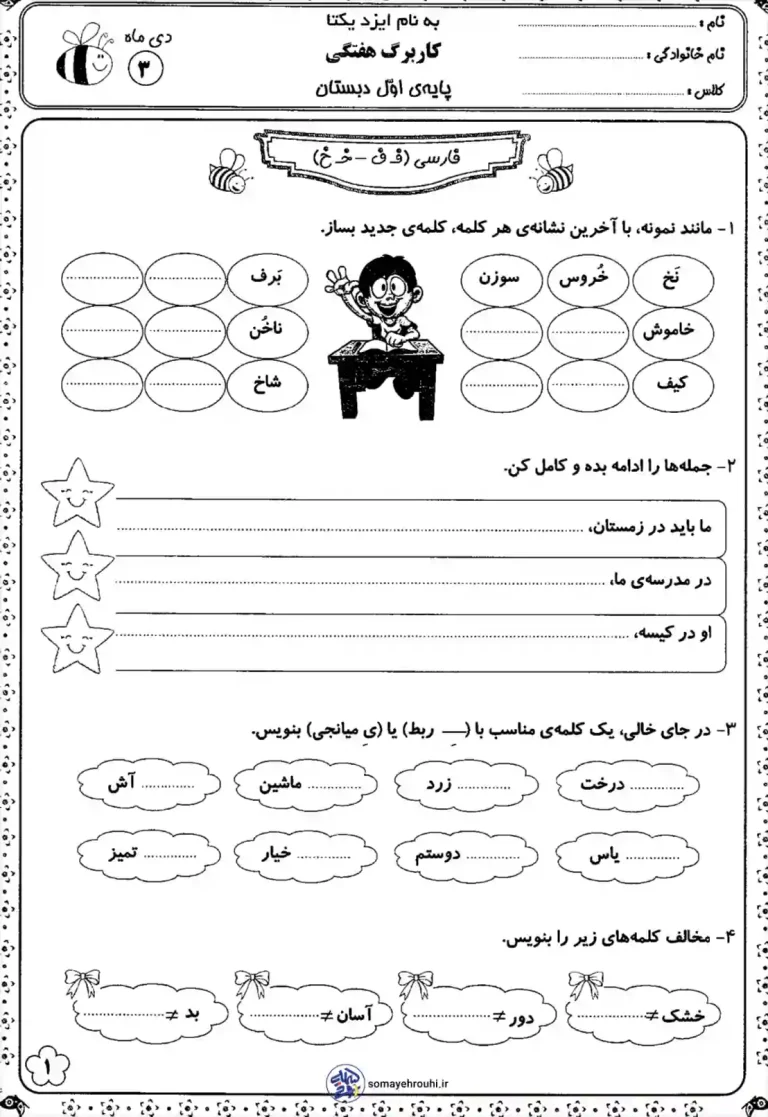 کاربرگ حاضر با چهار نوع تمرین متنوع و جذاب، تمامی جنبههای یادگیری زبان را در بر میگیرد. فعالیت اول، به تقویت آگاهی واجشناختی میپردازد؛ جایی که دانشآموزان باید با استفاده از آخرین نشانهی یک کلمه، یک کلمهی جدید بسازند (مانند استفاده از «ف» در پایان کلمه برای شروع کلمهای جدید). تمرین دوم، با هدف تقویت درک مطلب و خلاقیت، از دانشآموز میخواهد تا جملات ناقص را کامل کند. بخش سوم یک تمرین کلیدی در مورد دستور زبان و ساختار کلمات است؛ دانشآموزان باید با استفاده از کسرهی ربط یا «ی» میانجی، کلمات مرتبط را به هم وصل کرده و عبارتهای معنیدار بسازند. در نهایت، بخش چهارم با تمرکز بر تقویت واژگان، از دانشآموز میخواهد تا متضاد کلماتی چون «خشک»، «دور»، «آسان» و «بد» را پیدا کند، که این امر به گسترش ذخیرهی لغوی کمک شایانی میکند.