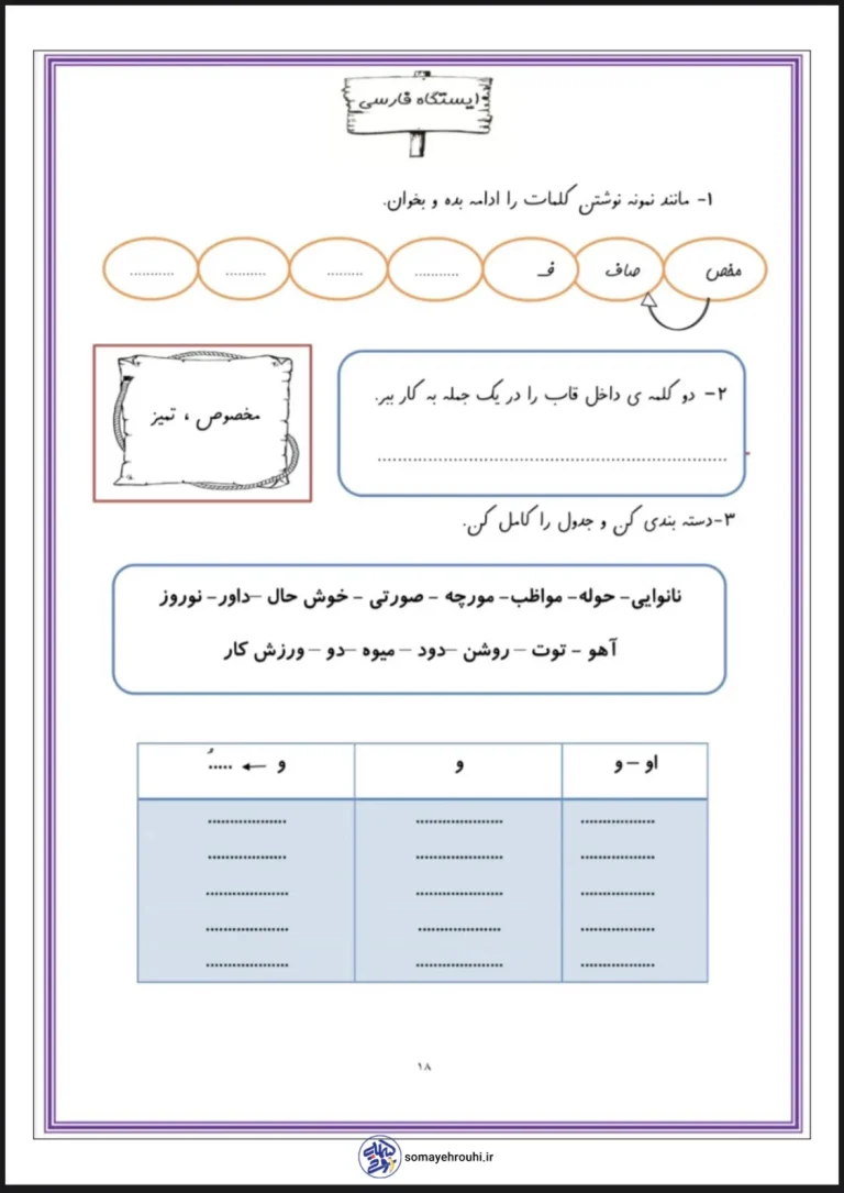 کاربرگ فارسی کلمه سازی پایه دوم دبستان نمونهای از فعالیتهای جذاب و ساختارمند درسی برای آموزش زبان فارسی به کودکان است که بر تقویت پایههای سوادآموزی تمرکز دارد. این تمرینها با هدف ارتقاء مهارتهای چهارگانه زبانآموزی (خواندن، نوشتن، گوش دادن و صحبت کردن) طراحی شدهاند. از تکمیل زنجیره کلمات همصدا مانند “مقض، صاف، صدف،…” تا دستهبندی لغات بر اساس ساختار املایی و آوایی (“او-و”، “و”، “و-ا…” و بخش کردن کلمات مانند “نا-نوا-یی”، “حـو-لـه” و…)، هر بخش یک پله برای تسلط کودک بر واژگان و ساختار زبان مادریاش است. این مسیر آموزشی با ایجاد یک “ایستگاه فارسی” شاد و هدفمند، یادگیری را به یک بازی فکری لذتبخش تبدیل میکند.