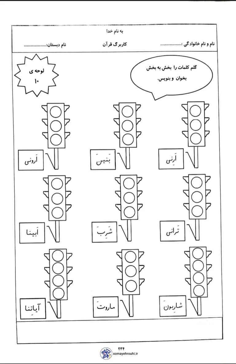 این کاربرگ قرآن لوحه ۱۰ اول دبستان برای کوچولو شما طراحی شده، یک ابزار آموزشی ساده و در عین حال مؤثر برای تثبیت مهارتهای نوپای خواندن قرآن در دانشآموزان است. تمرکز اصلی این کاربرگ بر بخش کردن کلمات قرآنی است که حاوی حروف و صداهای آموختهشده قبلی هستند. این فعالیت کمک میکند تا نوآموزان به درک درستی از ترکیب صداها و بخشهای کلمات برسند و آمادگی لازم برای روخوانی سادهتر قرآن را پیدا کنند.