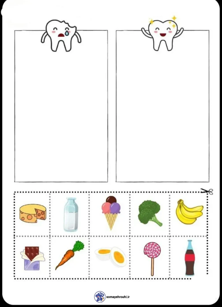 کاربرگ مراقبت از دهان و دندان با تمرکز بر تشخیص خوراکیهایی که بر سلامت دندان تأثیر مثبت یا منفی دارند طراحی شده است و دانشآموزان را وارد یک فعالیت طبقهبندی هدفمند میکند. در این کاربرگ، دو ستون مجزا در نظر گرفته شده که هر کدام مربوط به یک گروه مشخص از خوراکیها هستند و دانشآموز باید با دقت تصاویر را در ستون مناسب قرار دهد.