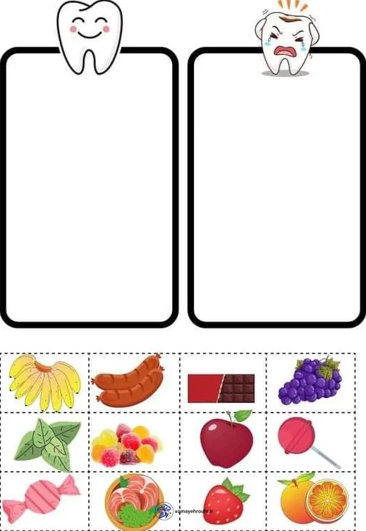 در این کاربرگ مراقبت از دهان و دندان از دانشآموز خواسته میشود تصاویر را بهصورت دقیق در ستون درست بچیند و از جابهجایی نادرست خودداری کند. تمرکز اصلی کاربرگ بر انجام صحیح دستهبندی و توجه به ویژگی هر خوراکی است و نتیجه کار بهصورت کاملاً مشخص در چینش نهایی تصاویر در دو ستون قابل مشاهده خواهد بود.