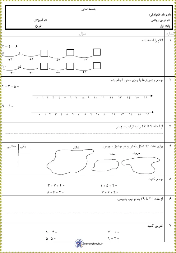 کاربرگ مرور تم 14 تا 19 ریاضی اول دبستان