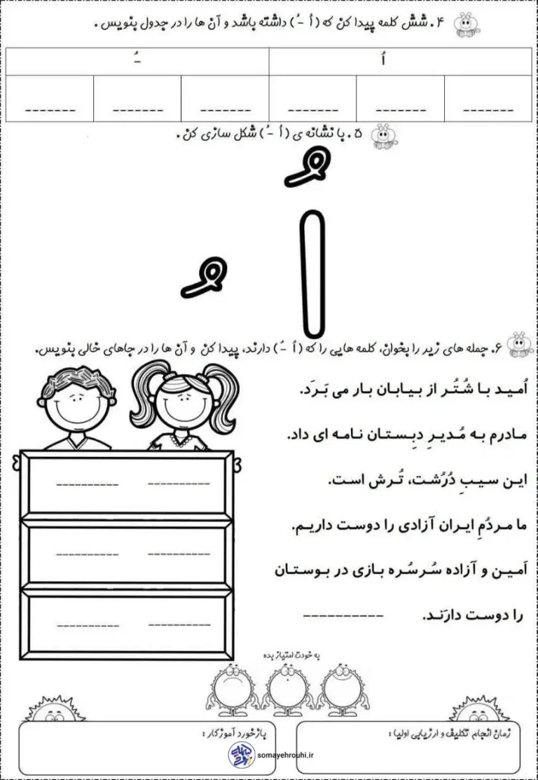 در این کاربرگ، کودکان با یافتن کلمات دارای نشانه «اُ»، نوشتن آنها در جدول، و تشخیص جایگاه نشانه در کلمات آشنا میشوند. تمرینها بهگونهای طراحی شدهاند که علاوه بر تقویت دقت دیداری و شنیداری، مهارت کلمهسازی و جملهخوانی را نیز افزایش دهند.
