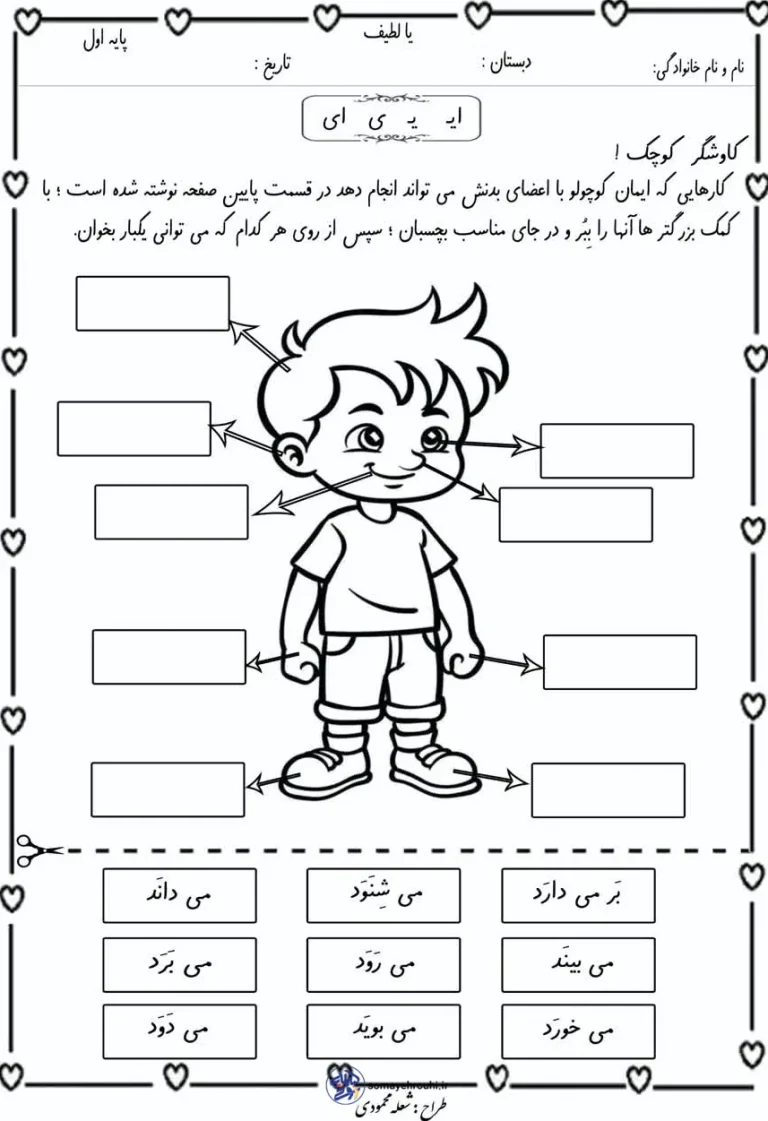 این کاربرگ نشانه ای از دانشآموزان میخواهد تا کارهایی را که «ایمان کوچولو» با اعضای بدنش میتواند انجام دهد و در پایین صفحه نوشته شدهاند، بُرش دهند و سپس با کمک بزرگترها (والدین یا معلم)، آنها را در جای مناسب مربوط به عضو بدن بچسبانند. در نهایت، دانشآموزان باید کلمات چسبانده شده را یک بار بخوانند.