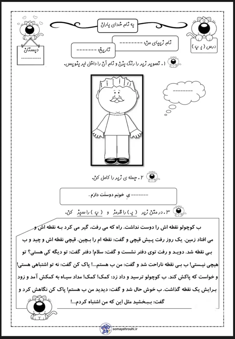 - ویژگیها: این کاربرگ با تلفیق تمرینهای دیداری، نوشتاری و درک زبانی، یادگیری چندحسی را فراهم میکند. وجود بخشهایی مانند نقاشی برای رنگآمیزی، کامل کردن جای خالی و یک داستان مرتبط، سبب افزایش انگیزه و تبدیل تکلیف به یک فعالیت لذتبخش میشود.