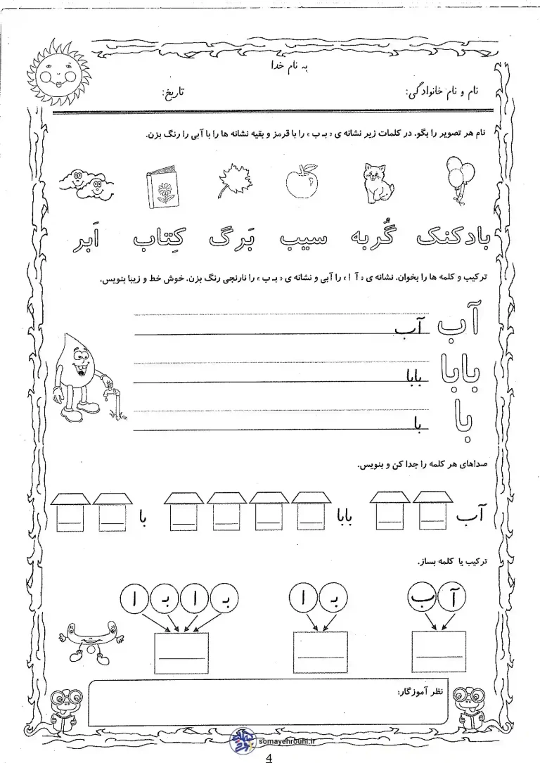 فعالیتهای کاربرگ نشانه های الفبا (آ ، ب) شامل: