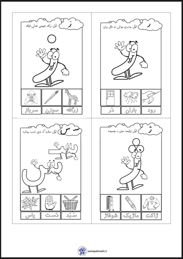 - شناخت دیداری و آوایی حروف: شکل و صدای صحیح هر حرف (مانند “ز” و “ر”) را به همراه کلمات مرتبط (زرافه، سرباز، رود، باران و…) بیاموزند.