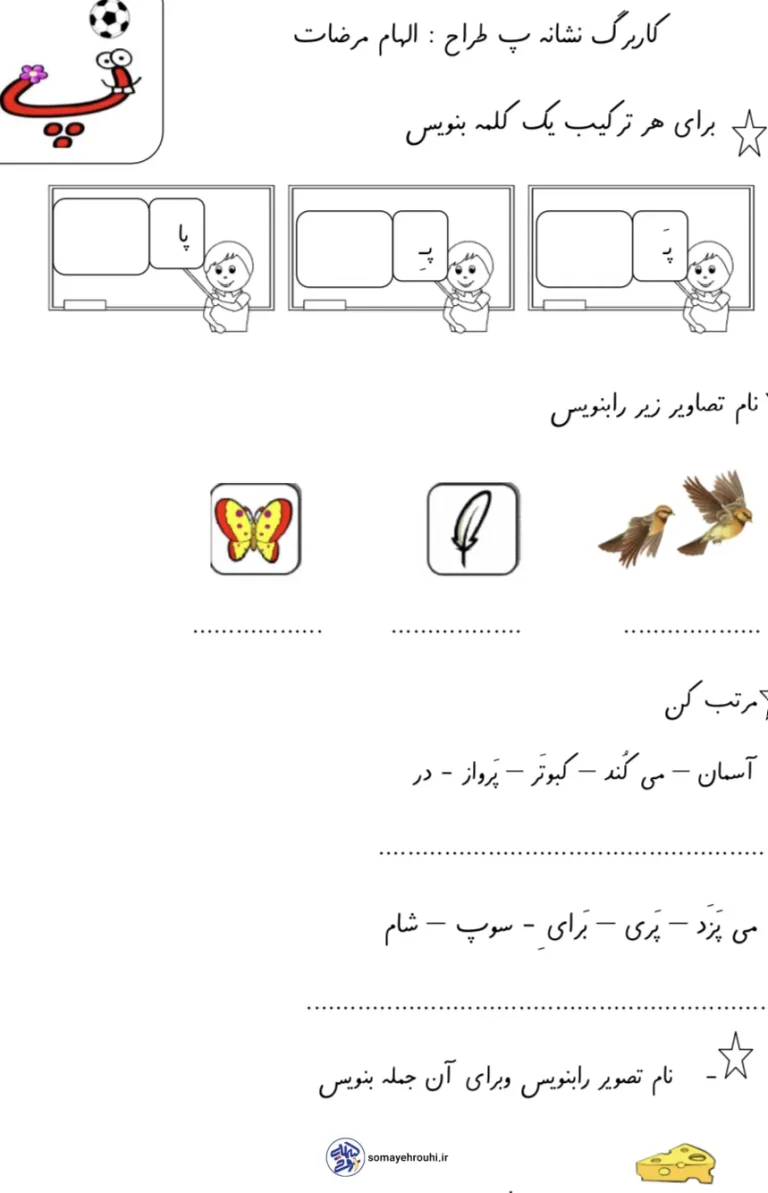 اگر به دنبال یک منبع آموزشی استاندارد، جذاب و مطابق با کتاب فارسی دبستان هستید، این کاربرگ انتخابی عالی است. ترکیب آموزش، تمرین و تصویرسازی، یادگیری نشانه «پ» را برای دانشآموزان آسان و ماندگار میکند.