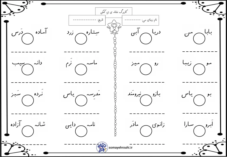 در کاربرگ نشانه ی یٍ کمکی، دانشآموزان با خواندن، کاملکردن و تشخیص کلمات دارای «یِ کمکی» مانند «آبی»، «زیبا»، «یاس»، «شانه» و… مهارتهای سوادآموزی خود را تقویت میکنند. چینش منظم واژهها و فاصلهگذاری مناسب، به افزایش دقت دیداری و تمرکز کودکان کمک میکند.