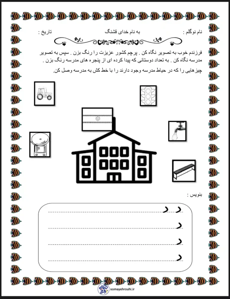 🌈 آمادهی یک روز هیجانانگیز در مدرسه هستید! این کاربرگ نگاره ۴ فارسی اول دبستان با تصاویر شاد و جذاب، فرصتی عالی برای آشنایی کودکان عزیز شما با محیط مدرسه و وسایلی است که معمولاً در حیاط یا اطراف آن میبینند. کودک شما ابتدا پرچم زیبای کشورمان را رنگ آمیزی میکند و سپس باید دوستانی را که از پشت پنجرههای مدرسه پنهان شدهاند، پیدا کند! در نهایت با یک فعالیت سرگرمکننده، تصاویری که در حیاط مدرسه کاربرد دارند را به ساختمان مدرسه وصل میکند. یک تمرین لذتبخش و هدفمند برای تقویت هوش و تمرکز فرزند دلبندتان.