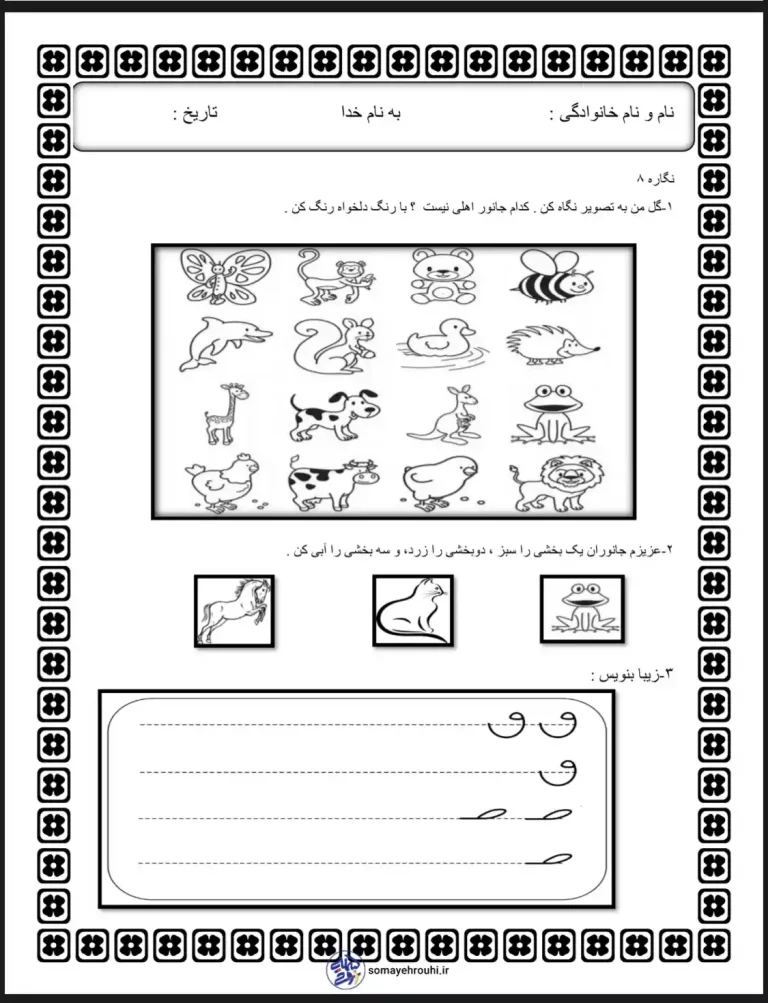 - شناخت و طبقهبندی حیوانات: آموزش تمایز بین حیوانات اهلی (خانگی) و حیوانات وحشی از طریق رنگآمیزی و انتخاب. (تمرین ۱)