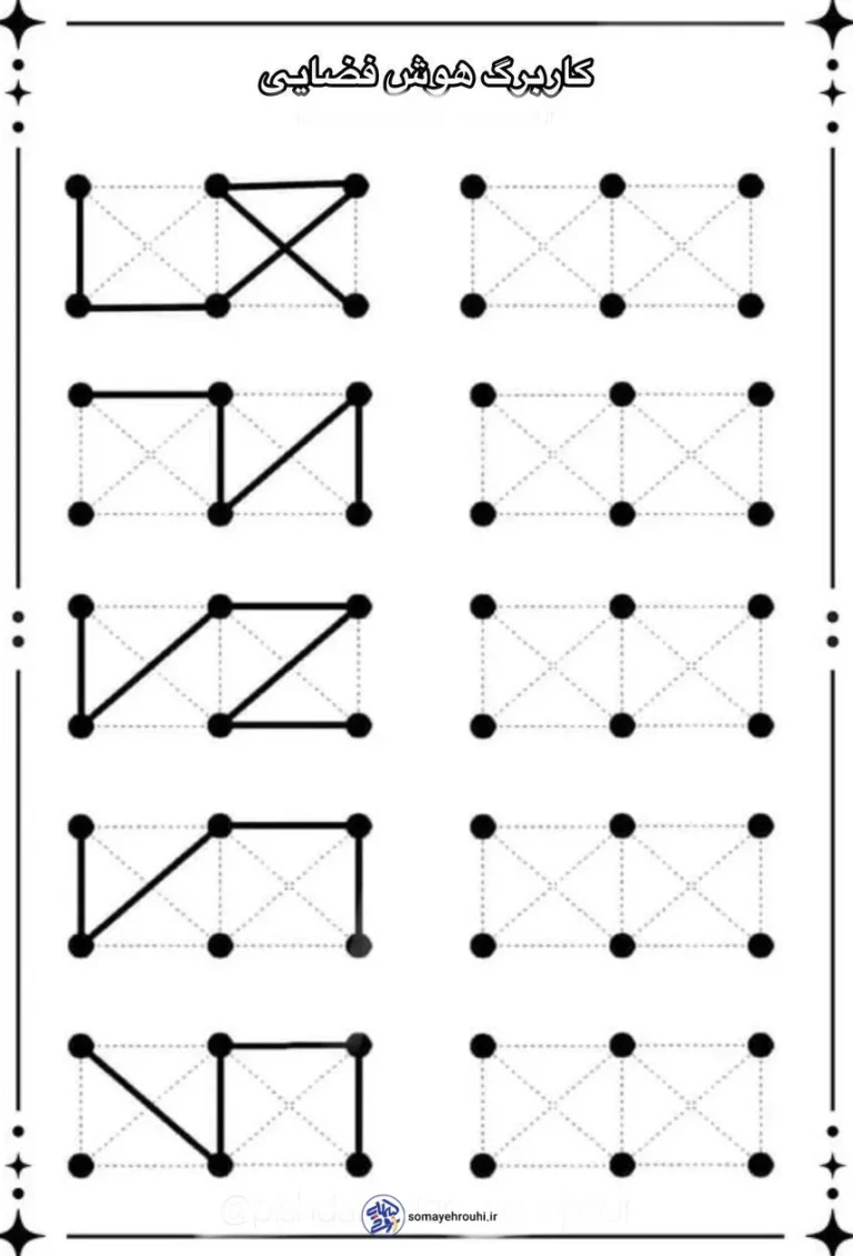 این مجموعه کاربرگ های تقویت حافظه دیداری و هوش فضایی پیش دبستانی یک منبع آموزشی تخصصی برای کودکان پیشدبستانی است که با هدف تقویت حافظه دیداری و درک روابط فضایی طراحی شده است. در این فعالیتها، کودک باید با مشاهده یک الگوی ترسیمشده روی نقاط در سمت چپ، همان طرح را با دقت روی شبکه نقاط خالی سمت راست تکرار کند. این فرآیند به مغز کمک میکند تا جزئیات بصری را تحلیل کرده و فواصل و زوایا را به درستی تشخیص دهد.