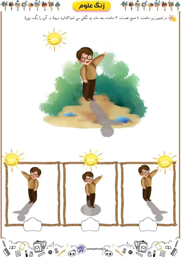 - آشنایی با مفهوم سایه و ارتباط آن با جایگاه خورشید در ساعات مختلف روز (مانند تغییر شکل سایه در طول روز).