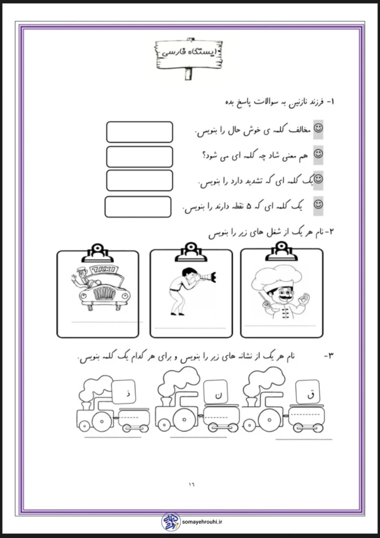 - ویژگیها: طراحی جذاب و کودکانه با استفاده از تصاویر ملموس (تاکسی، آشپز، کشاورز) برای افزایش انگیزه، تنوع در نوع سؤالات برای درگیر کردن بخشهای مختلف ذهن و تمرکز بر مفاهیم پایهای زبان فارسی.