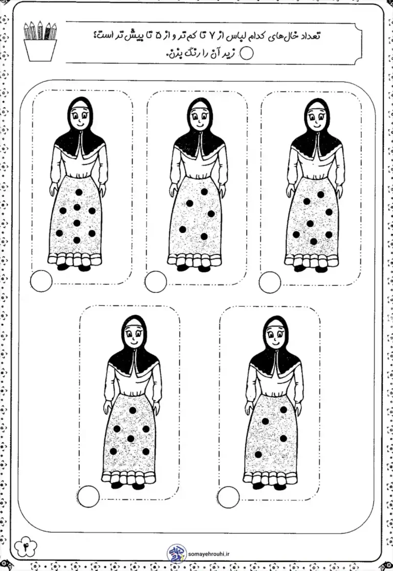 در این کاربرگ هوش اول دبستان، دانشآموزان با یک تمرین جذاب و تصویری مواجه میشوند که هدف آن پرورش مهارتهای مشاهده دقیق، شمارش، و مقایسه کمیتهاست. در این فعالیت، دانشآموز باید لباسهایی را که تعداد خالهایشان بین ۵ تا ۷ قرار دارد، شناسایی کند و زیر آنها را رنگ بزند. این گونه تمرینها کمک میکنند تا ذهن کودک فعالتر شود و مفهوم بازههای عددی و مقایسه مقادیر را به شیوهی ملموس و عینی بیاموزد. همچنین به کودکان آموخته میشود چگونه دستورالعملها را به دقت بخوانند و اجرا کنند.