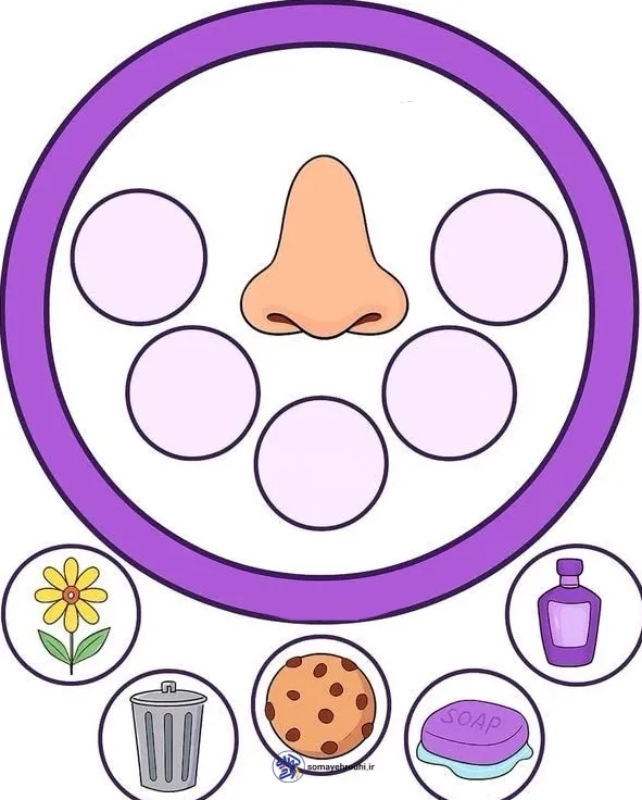 از دانشآموز خواسته میشود با دقت به تصاویر نگاه کند و تشخیص دهد کدام اشیا بوی خوب و خوشایند دارند و کدامیک بوی بد یا ناخوشایند. سپس تصاویر مربوط به بوهای خوب را در دایرههای اطراف بینی قرار دهد یا آنها را به محل مناسب وصل کند.